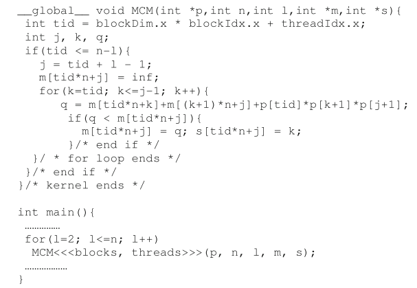 - 将第三层循环放在thread内串行执行 一个thread的工作:给定一个子链,循环得出其在不同位置拆分的代价,找出针对这个子链的最优解,m[i, j]和s[i, j]
