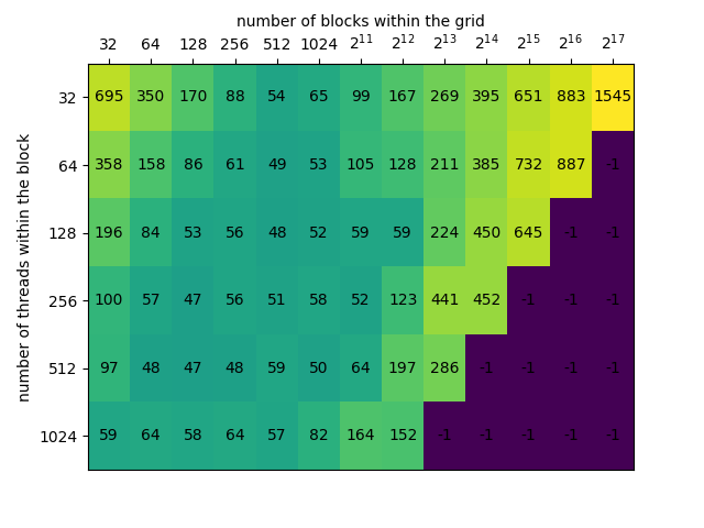 需要对number of blocks和number of threads进行试验才能得到应为kernel配置的值。