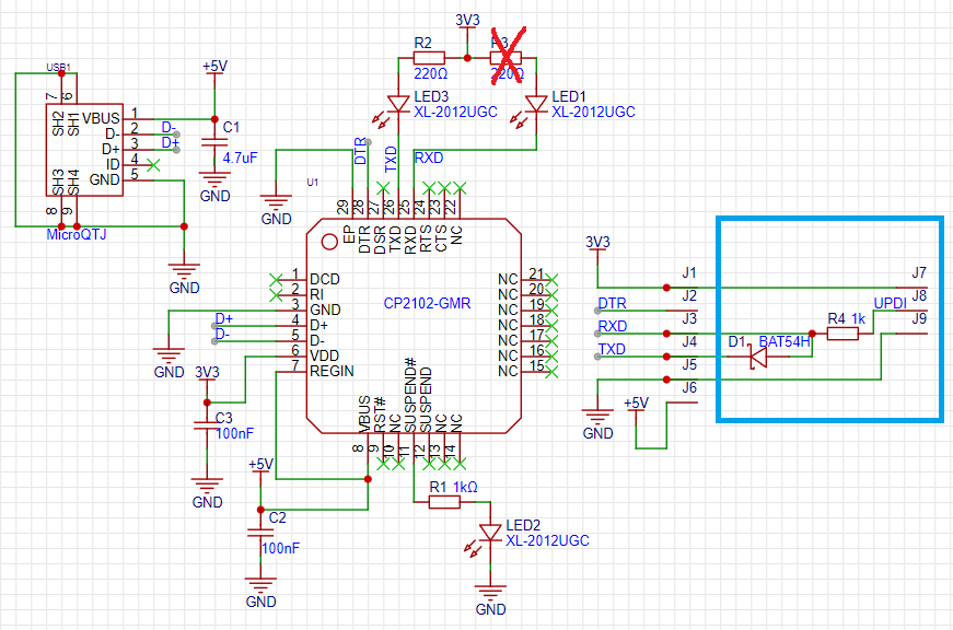 - 在UPDI到Tx之间添加二极管(推荐)或电阻。电流方向为从UPDI流向Tx。