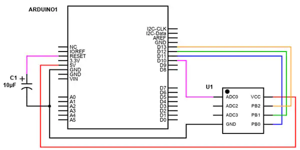 - 需连接的管脚:MISO、MOSI、SCK、RESET(PB0、1、2、5),以及VCC和GND,与烧写器上对应引脚相连。