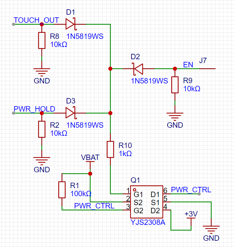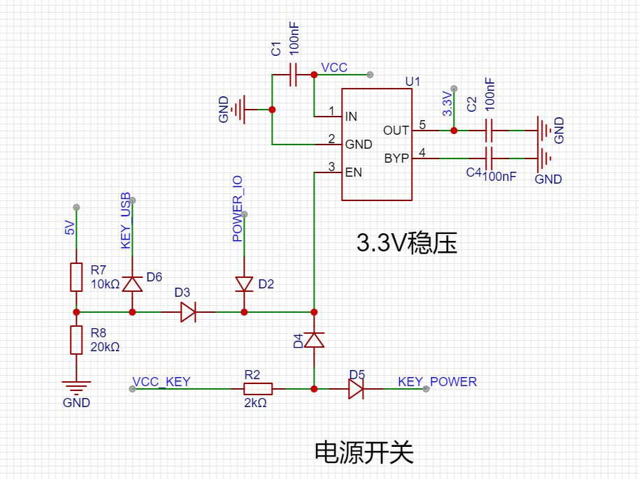 U1是一个输出为3.3V的稳压芯片,该芯片带有使能功能。 即第3(CE)脚,给该引脚输入高电平,打开输出,输入低电平,关闭输入。VCC_KEY是按键脚,一端接到电源(VCC),另一端连接到单片机引脚(KEY_POWER),和U1使能脚电路。 按键开机过程 在未插入充电时。 按键按下后,VCC流过VCC_KEY、D4,给CE脚一个高电平使能3.3V输出,此时整个系统得电单片机开始运行。程序首先检测KEY_POWER脚电平,**如果该电压为高电平,**说明是按键开机控制POWER_IO脚输出高电平锁定CE脚电平。这时松开手,由于POWER_IO为高电平会继续使能U1输出。 充电开机过程 在未按下按键时。 插入充电器,此时5V得电,经过D3给CE脚高电平使能3.3V,输出单片机运行,程序开始检测KEY_POWER电平。由于内部配置下拉输入,所以识别到为低电平程序判断案件为按下时运行即充电开机。 关机过程 进入关机功能,确认关机后,系统拉低POWER_IO使能3.3输出。