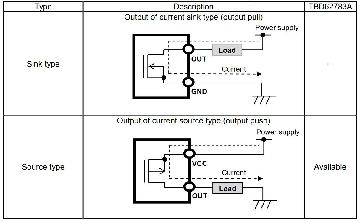 Darlington Transistor Arrays § 阵列类型:漏型/灌电流(sink current)与源型/拉电流(source current) 62783,源型达林顿管阵列 注意根据负载的不同会有压降!